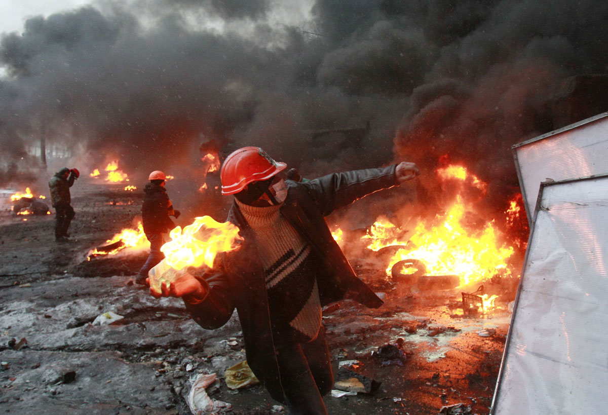 A pro-European protester throws a Molotov cocktail towards riot police near burning tyres during clashes in Kiev January 22, 2014. Ukraine’s prime minister denounced anti-government protesters as “terrorists” on Wednesday, but in what appeared to be his first real move to end weeks of unrest President Viktor Yanukovich held talks with opposition leaders. REUTERS/Gleb Garanich (UKRAINE – Tags: POLITICS CIVIL UNREST TPX IMAGES OF THE DAY) ORG XMIT: MOS144