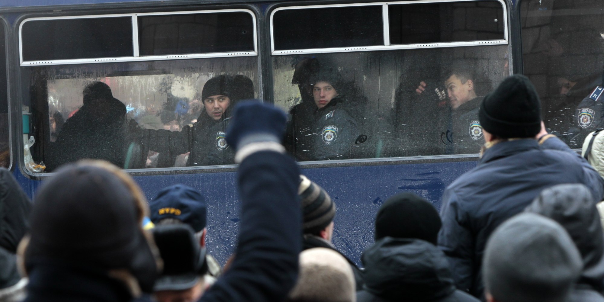 Pro-European Union activists shout toward a bus carrying riot police outside Kiev’s City Hall, Ukraine, Wednesday, Dec. 11, 2013. Police in Ukraine on Wednesday pulled back as protesters claimed victory after an overnight face-off in which authorities removed some barricades and tents and scuffled with demonstrators occupying Kiev’s main square. (AP Photo/Sergei Chuzavkov)
